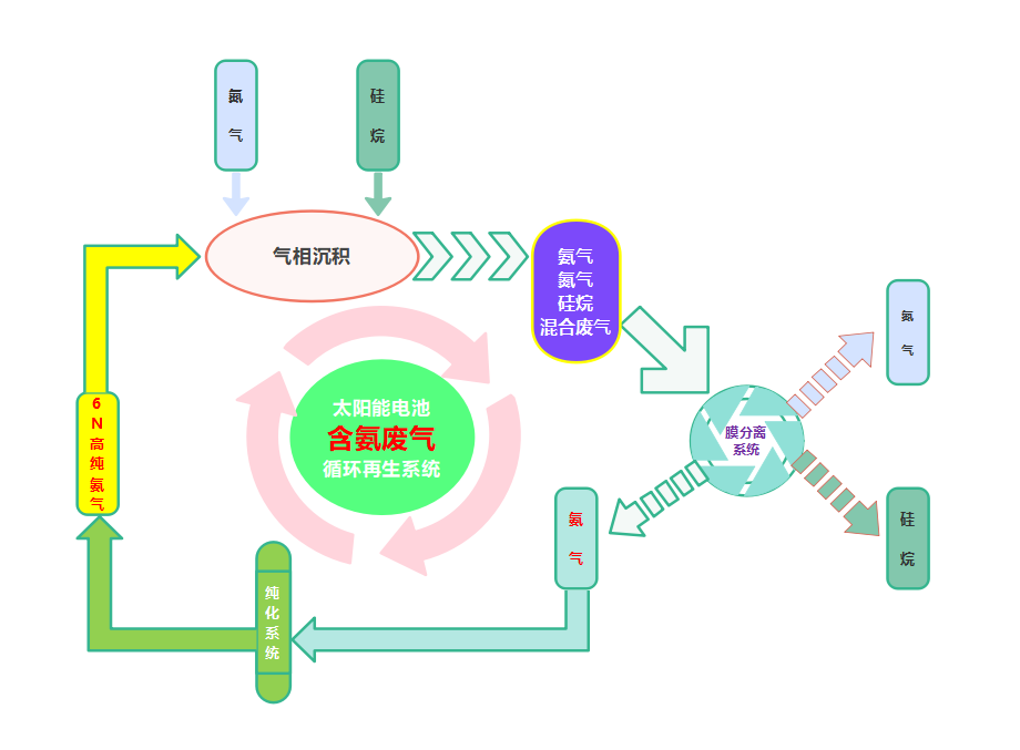 这项技术的最大亮点在于其高度的环保性和经济效益。一方面,硅烷氨气的循环再生利用大大减少了废弃物排放,有利于环境保护,符合国家提出的“双碳”战略目标。另一方面,通过降低原材料损耗和采购成本,显著提升了相关产业的经济效益,增强了企业的市场竞争力。